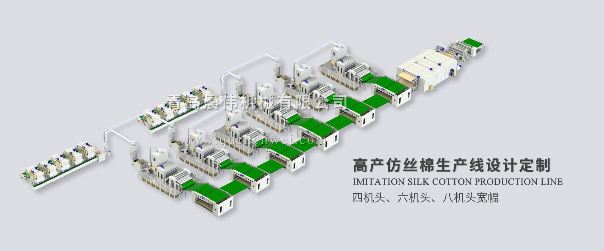 我公司主要产品:电子秤重开包机、开松机、给棉机、气压棉箱、(高速)单锡林双道夫梳理机、(高速)双锡林双道夫梳理机、铺网机、中速针刺机、高速针刺机、烘箱/烘房、烫光机、热轧机、收卷切片机,无纺布设备、仿丝棉设备、防尘布设备、喷胶棉设备、无胶棉设备、硬质棉设备、土工布设备生产线、椰棕床垫生产线、大棚保温被生产线、蚕丝被生产线、床上用品设备等各种无纺布机械设备。